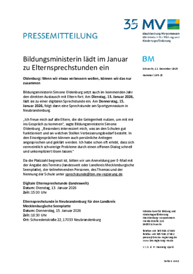 Elternsprechstunde in Neubrandenburg für den Landkreis Mecklenburgische Seenplatte