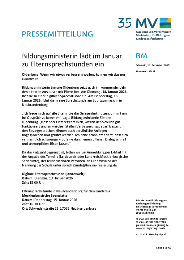 Elternsprechstunde in Neubrandenburg für den Landkreis Mecklenburgische Seenplatte